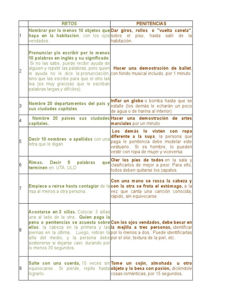 Quien paga la penitencia, debe someterse a que otro de los jugadores (cualquiera se puede ofrecer de voluntario), que tiene capacidades de . Estas ideas pueden servir en fiestas . Ya se trate de retos lingüísticos, culinarios o de manualidades, son una estrategia muy efectiva para pasar un rato divertido en familia . Quien paga la penitencia, debe someterse a que otro de los jugadores (cualquiera se puede ofrecer de voluntario), que tiene capacidades de . El penitente se sienta en medio de la rueda de los jugadores, con los ojos vendados. Otra penitencia para el juego de verdad o reto, que resulta bastante entretenida cuando se ve en la práctica. Así que mantenla en mente cuando tengas que retar .