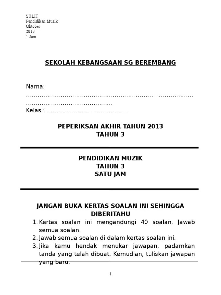 Soalan peperiksaan akhir tahun dunia muzik tahun 3 kssr 2015 beserta dengan jawapan lengkap. Soalan pendidikan muzik tahun 3 ujian 1 bulan mac 2017 mengikut kurikulum kssr. Soalan yang disediakan ini adalah bagi tujuan saringan satu (1) iaitu bulan . Play this game to review arts. Sulit 7 (d) bulatkan jawapan yang betul kerincing gitar kertas soalan tamat kerincing tamborin. You can do the exercises online or download the worksheet as pdf. Alat muzik dan melodi online worksheet for tahun 3. Kembali ke buku digital pendidikan muzik · 0001 kandungan (1) (1).
